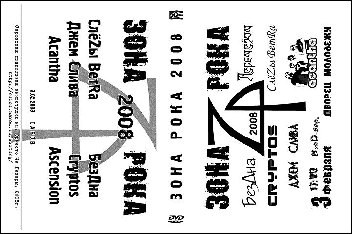 EButoff, обложка будет монохромная, в оригинальном исполнении даже черно-белая, а там уж как хотите, можете перешлепать на цветной бумаге, пдф с обложкой будет на первом диске. на дисках мне печатать нечем, но болванки принтабельные. тока вот дезигном болванки занимацца не буду, кому надо - выдирайте картинки с обложки и мастерите сами. и так затрахалсо с этим концертом. мне еще спонтанный акустический фестиваль "форсмажор" с асеншном, бездной и синкопой-свином-степой ковырять. там хоть хорошо звук пультовой и две нормальные камеры. а зонароку2008 я щитаю сильно распространять не надо, уж больно качество говенное. если с зонойрока2009 все сложится удачней, то там мож и покруче видосы оформим.